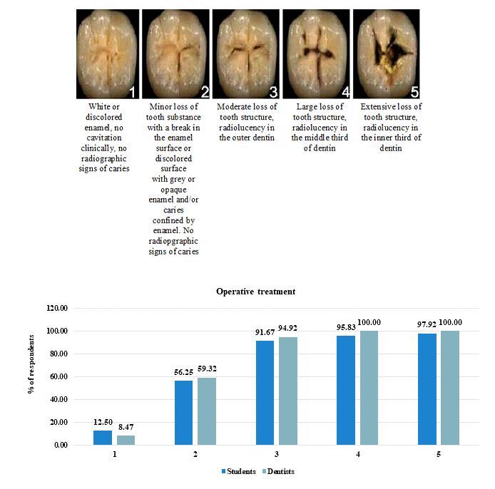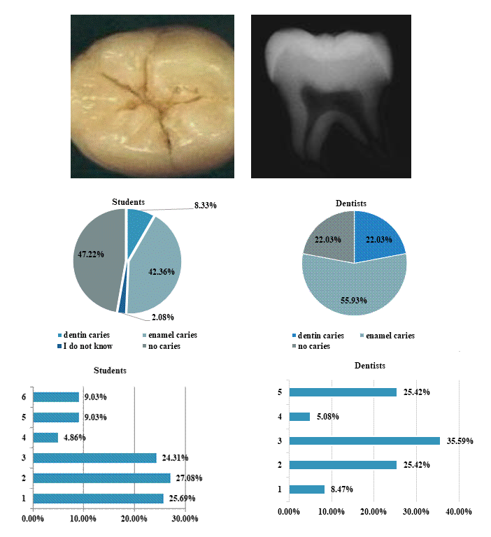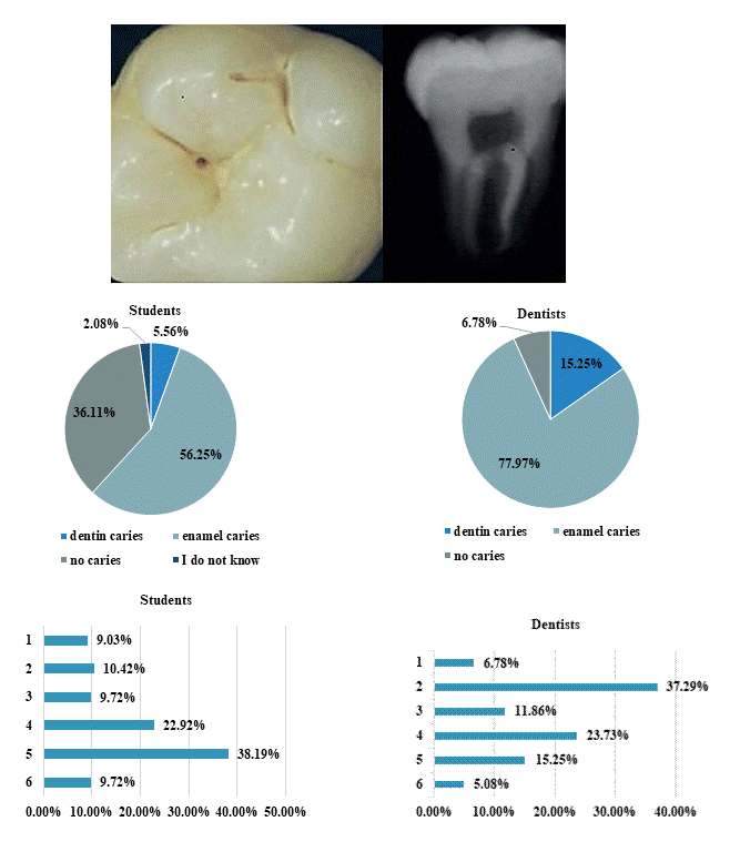 The research tool was questionnaire developed by Tubert-Jeannin et al. [8] and modified by the authors. The fourth- and five-year dental students from Poltava state medical university and the dentists from government-owned and private clinics in Poltava were interviewed. The questionnaire consisted of two parts of a Google form, a link to which was sent to student group chats on Viber. The first part collected data on gender and length of dental service (assistance for students), while the second part consisted of close-ended questions MCQ about three clinical scenarios and proximal carious lesions. Two of the clinical scenarios had a photo of a questionable occlusal lesion of a permanent molar with a brief explanation and three questions regarding the diagnosis, management of caries, and restorative material. The third scenario illustrated different clinical manifestations of caries on the occlusal surface of a lower primary molar with the question, "Which lesion do you think requires immediate operative treatment?"