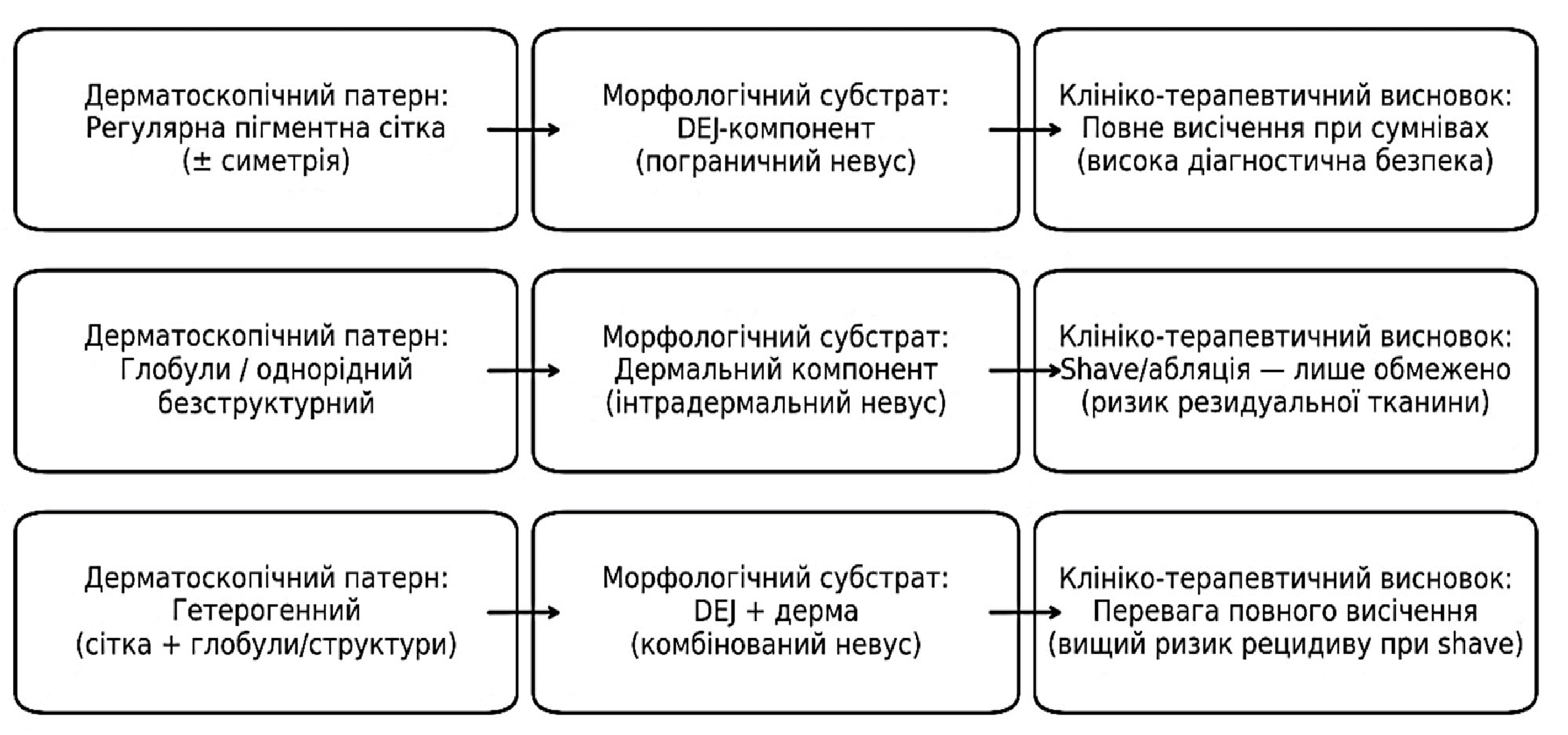 Одним з ключових практичних завдань сучасної дерматології є трансляція дерматоскопічних даних в обґрунтоване клінічне рішення щодо вибору методу лікування меланоцитарного невуса. На відміну від діагностичних алгоритмів, спрямованих передусім на виявлення меланоми, лікувальна тактика потребує оцінювання не лише ступеня дерматоскопічної атипії, а й прогнозованої морфологічної структури утворення, глибини залягання меланоцитарного компонента та ризику його неповного видалення.