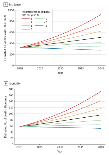 Актуальність удосконалення підходів до ведення меланоцитарних невусів посилюється глобальними онкоепідеміологічними трендами. За оцінками Всесвітньої організації охорони здоров’я, надмірна експозиція ультрафіолетового випромінювання у 2020 році була асоційована приблизно з 325 000 випадків меланоми шкіри та 57 000 смертей у світі [3]. Додатково, за даними Міжнародного агентства з вивчення раку (IARC), у 2022 році у світі було зареєстровано близько 331 700 нових випадків і 58 700 смертей від меланоми, причому понад 80% випадків були атрибутовані ультрафіолетовому опроміненню (267 тис. із 332 тис.) [4]. Хоча меланома не є безпосереднім об’єктом цього огляду, ці дані формують важливий контекст: точна оцінка пігментних утворень й обґрунтований вибір тактики щодо меланоцитарних невусів є складовою ширшої системи раннього виявлення та профілактики злоякісних новоутворень шкіри. Прогностичні розрахунки свідчать про суттєве зростання глобального тягаря меланоми в найближчі десятиліття. Очікується, що до 2040 року кількість уперше виявлених випадків цього захворювання може перевищити півмільйона, що відповідає приросту більше ніж на 50% порівняно з показниками 2020 року. Паралельно прогнозується істотне збільшення летальності: орієнтовна кількість смертей від меланоми може зрости майже на дві третини з приблизно 57 тис. у 2020 році до близько 96 тис. у 2040 році, за умови відсутності змін у поточних вікових показниках ризику. Важливо зазначити, що наведені прогнози базуються виключно на демографічних чинниках, зокрема зростанні чисельності населення та його старінні, і не враховують можливих змін у віковоспецифічній захворюваності на рівні окремих країн або регіонів. За таких умов лише стійке глобальне зниження показників захворюваності та смертності більше ніж на 2% могло б запобігти абсолютному зростанню кількості випадків меланоми у 2040 році (рис. 2) [1].