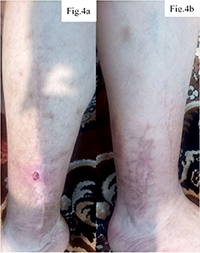 Postoperative wound care was performed outpatient using gauze compresses with 2% povidone-iodine solution, changed twice daily. However, insufficient aseptic conditions may have contributed to local inflammation. At 7-10 days post-surgery, pain, swelling, and skin hyperemia persisted despite intact sutures. After suture removal following tibial osteosynthesis, inadequate wound care continued with the same treatment regimen. Impaired drainage – due to blockage or insufficient outflow – and wet dressings without timely changes created conditions for skin maceration and microbial colonization, leading to local inflammation (Fig. 3). Incomplete epithelialization left the wound vulnerable to microtrauma and infection, consistent with findings by Сhang F. et al. (2024) [18]. The absence of antibiotic therapy contributed to the formation of a chronic serous-purulent process, manifested by leakage of wound contents, hyperemia, and repeated wound opening. As a result, prolonged dressing changes became necessary, since restoration of the skin barrier and control of the exudative phase were delayed, which aligns with the findings of Uberoi A., McCready-Vangi A., Grice E.A. (2024) [19]. This delayed repair and increased the risk of implant instability.
