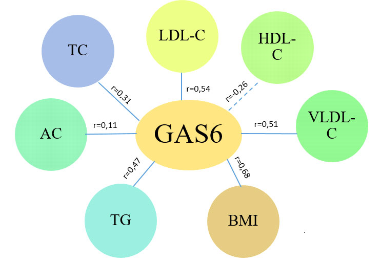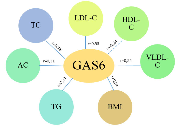 Thus, the established relationship between elevated GAS6 levels in blood serum and the severity of atherogenic dyslipidaemia confirms that this protein may act as an important biochemical mediator that reflects the degree of metabolic disorders and, presumably, exacerbates the processes of atherosclerosis progression and myocardial remodelling, while the link with BMI indicates that GAS6 protein activation is closely associated with excess body weight and obesity and reflects the severity of metabolic dysfunction directly related to the volume of adipose tissue.