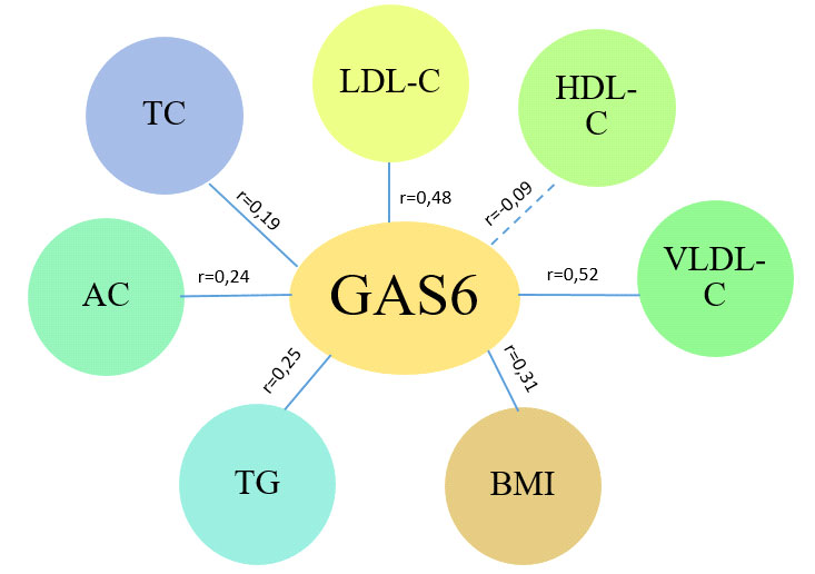 Strong positive correlations were found with BMI (r=0.68; p<0.05), LDL-C (r=0.54; p<0.05) and VLDL-C (r=0.51; p<0.05) and moderate direct correlations with TG (r=0.47; p<0.05), indicating that as serum GAS6 levels increase in this cohort of patients, the most atherogenic lipid metabolism fractions increase proportionally. We also found weak direct correlations with TC (r=0.31; p>0.05), HDL-C (r=-0.26; p>0.05), and AC (r=0.11; p>0.05), which did not reach the level of significance.