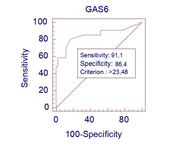 Qualitative data are presented as absolute numbers and percentages (n, %). The comparison methods for quantitative data included Student's t-test or Mann-Whitney test; for qualitative data the χ² (Сhi-square) test was used. Statistical data processing was performed using parametric statistics methods with Microsoft Excel 2010 (Licence: Microsoft 365 Subscription 16.104.1 (26010228)). The normality of the distribution of quantitative variables was assessed using the Kolmogorov–Smirnov criterion. All normally distributed data are presented as M±SD (mean ± standard deviation). The comparison of mean values was performed using Fisher's criterion (F). Statistical analysis was performed using Spearman's correlation coefficient to evaluate the relationship between GAS6 and lipid profile parameters. To determine the potential prognostic value of GAS6 and its effectiveness in risk stratification, ROC (Receiver Operating Characteristic) analysis was conducted. The critical level of significance was set at p<0.05 [10].