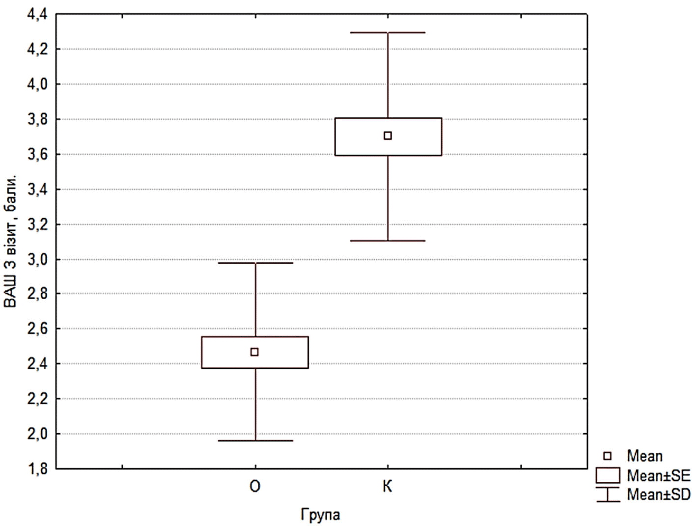 Упровадження роботизованої системи в протокол фізичної терапії підтвердило її високу ефективність у зниженні больового синдрому. В обох групах було зафіксовано зниження інтенсивності болю. Слід підкреслити наявність достовірної різниці показників саме між ІІ та ІІІ етапами оцінювання (p<0,05), що вказує на виражену позитивну динаміку у віддаленому періоді реабілітації. Така закономірність свідчить про анальгезуючий ефект застосованих методів та стійкість досягнутого терапевтичного результату на фінальних етапах відновлення (рис. 3).