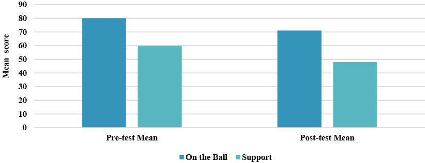 - The results show a decrease in players' performance on both on-the-ball and off-the-ball actions in the post-test compared to the pre-test, reflecting the effects of fatigue. Specifically, the mean scores for player performance on "On-The-Ball Attacker" and "Support" decreased after fatigue was induced, indicating a reduction in tactical decision-making and positional awareness during the game.