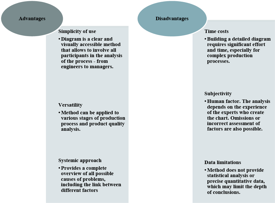 The Ishikawa diagram is an indispensable tool in pharmaceutical production, its usage contributes to the improvement of production processes, raising quality standards and preventing risks [9, 10]. However, it is important to consider the disadvantages of this method when combining it with other analytical tools for a deeper and more accurate analysis. The advantages and disadvantages of the Ishikawa diagram method are shown in Figure 1.