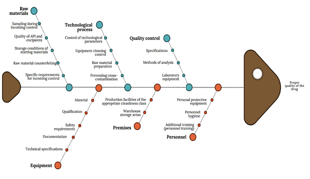 The Ishikawa diagram is an effective analytical tool for ensuring the quality of medicinal products. The main purpose of this method is to systematically identify and classify probable problems or causes of their occurrence in the production process. The use of the method is due to the complexity of the production of pharmaceutical products, when a combination of factors, such as the quality of incoming raw materials, equipment, technological methods, personnel, premises, etc., that can affect the quality of products both directly and indirectly.