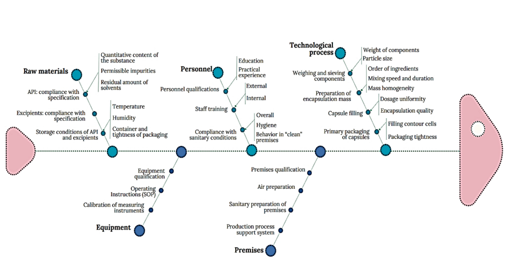 The Ishikawa diagram gives the opportunity to structure the analysis process by highlighting the main categories of factors that can affect the quality of the medicinal product. This provides a comprehensive approach to solving problems, eliminating chaos in the search for causes. By detailing each category of factors, the root causes that lead to product defects, for example, uneven dosing of APIs in dosed preparations, can be identified. Usage of the diagram allows us to predict possible risks and create preventive measures aimed at improving production processes. This method admits enterprises to comply with high quality standards, such as the international Good Manufacturing Practice (GMP) standards and the international quality management system (ISO), ensuring quality control at all stages of production.