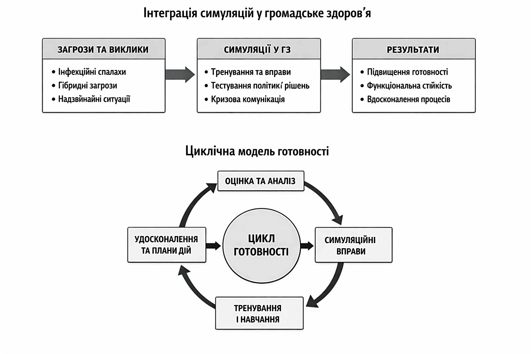Термін «симуляційна модель» у межах цього дослідження використовується як концептуальна рамка проєктування та вбудовування симуляційних вправ у цикл готовності системи громадського здоров’я.
